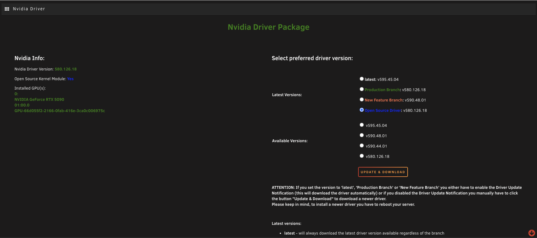 If you've got a 50 series GPU, you'll need the open source driver. The standard latest driver doesn't work with 5000 series cards. Hit update and download to grab the correct one. (This applies regardless of whether you're using the card for AI work or for gaming with something like Steam Headless.) It'll take a while to download and you'll need to reboot the server once it's done.