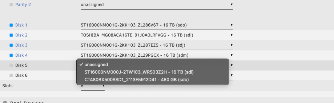Lorsque vous importez un pool ZFS dans Unraid, vous devez assigner chaque disque de votre pool d'origine, y compris ceux utilisés pour les vdevs de support, aux emplacements du pool. Unraid reconnaîtra automatiquement le rôle de chaque disque (données, log, cache, spécial, ou dedup) une fois que l'array démarre. Vous n'avez pas besoin de spécifier manuellement quel disque remplit quel rôle.